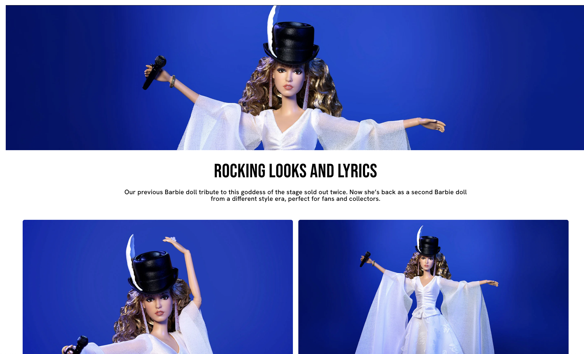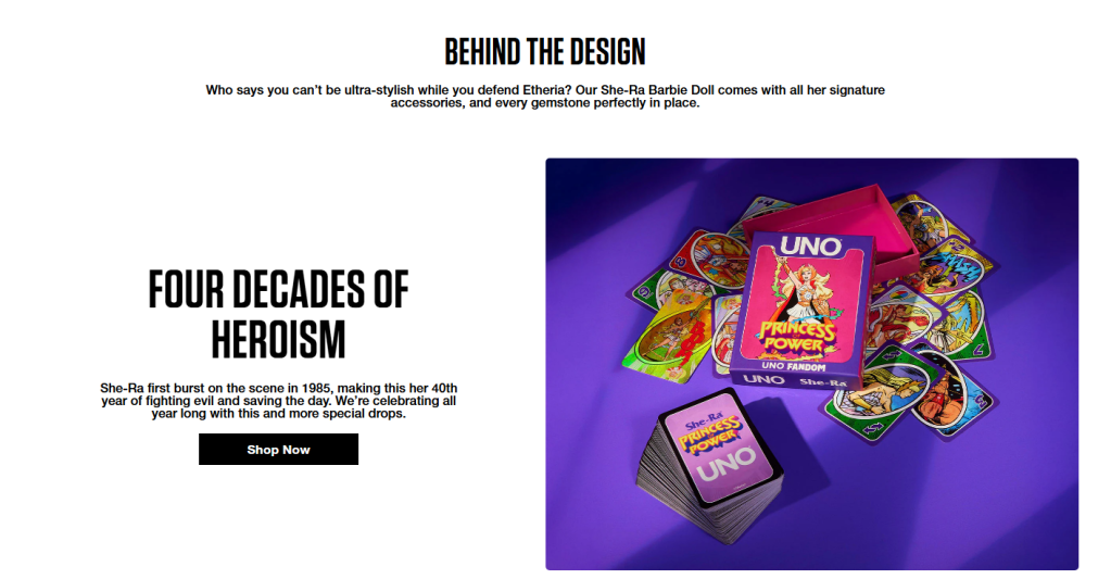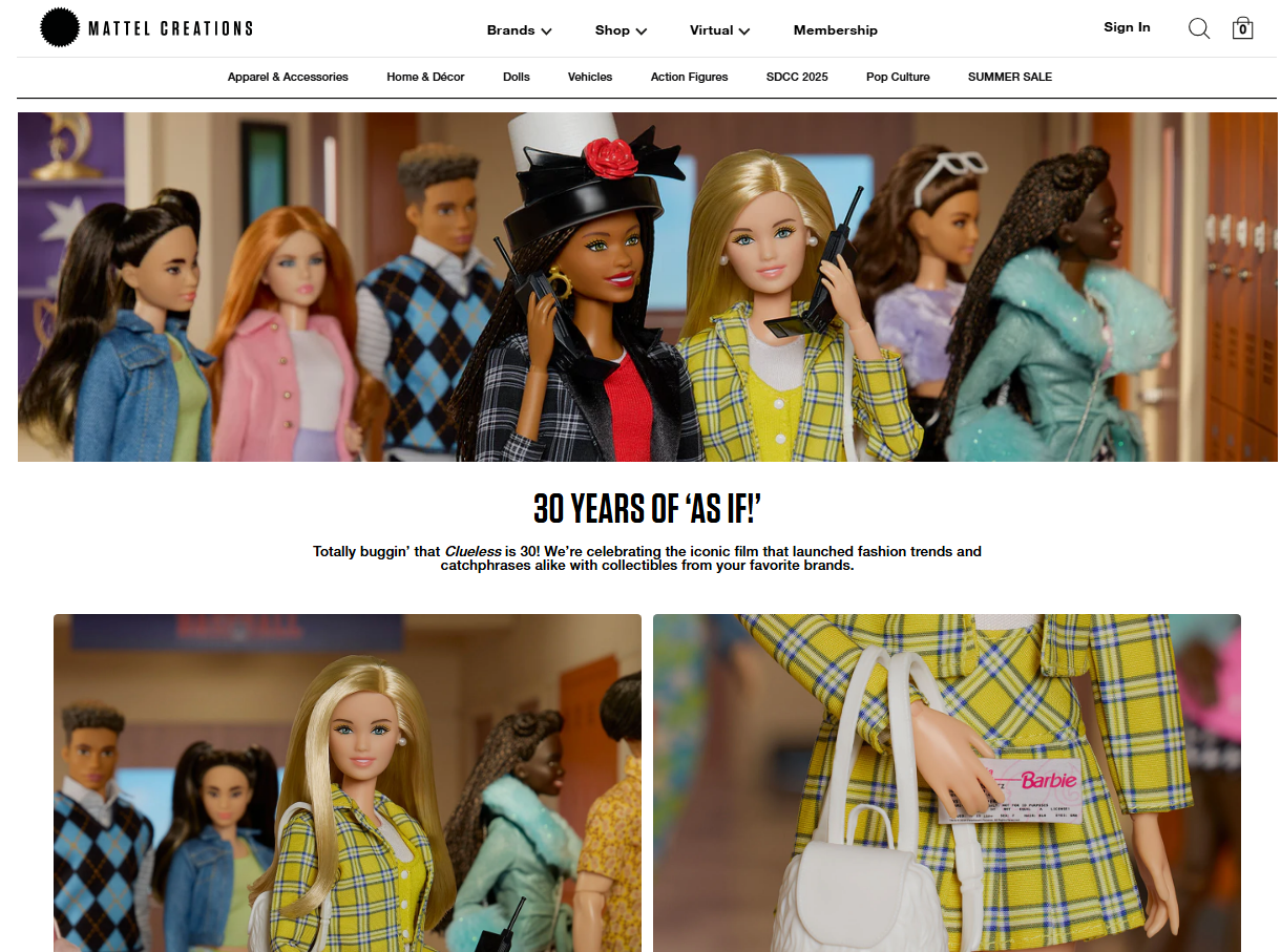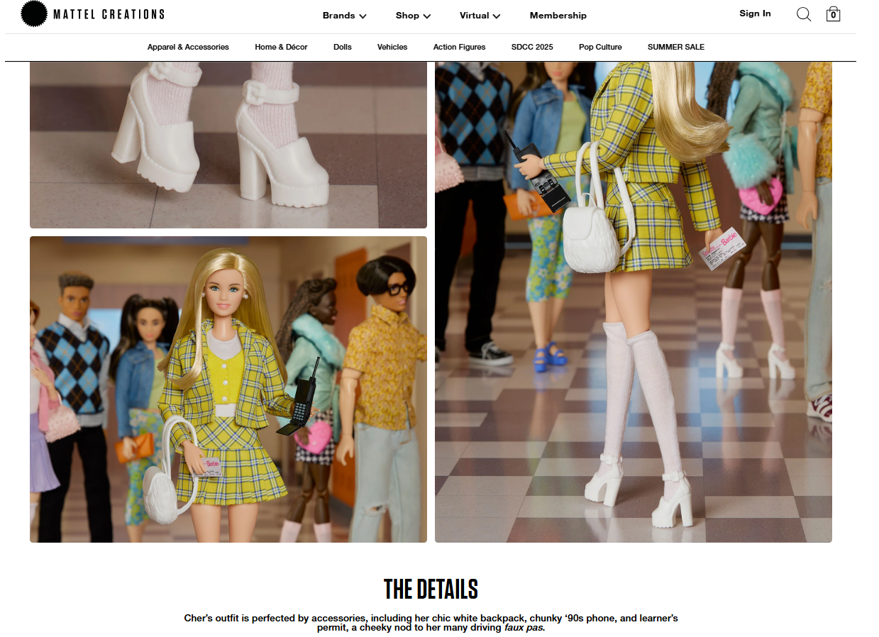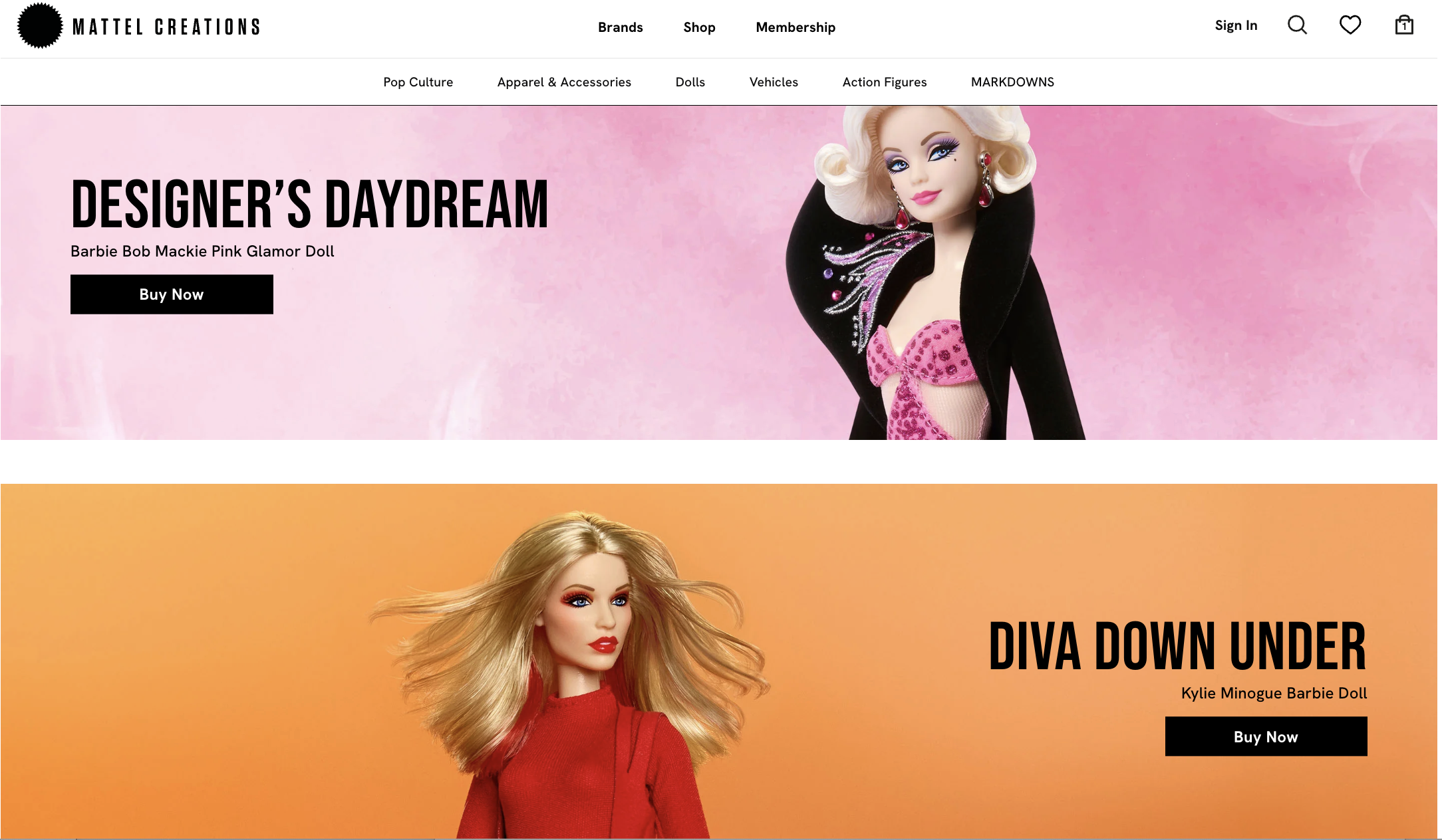 Examples of product pages done for various Mattel brands, intended for an adult collector audience.