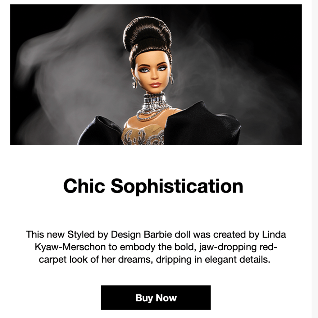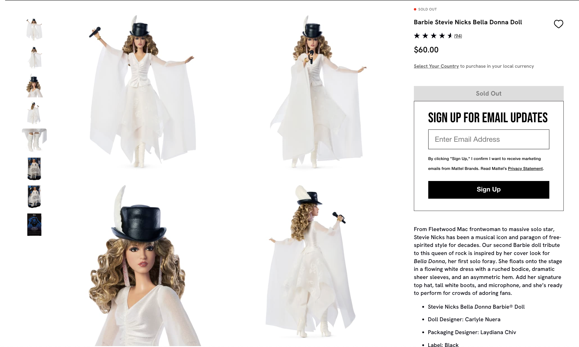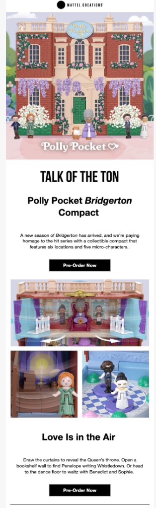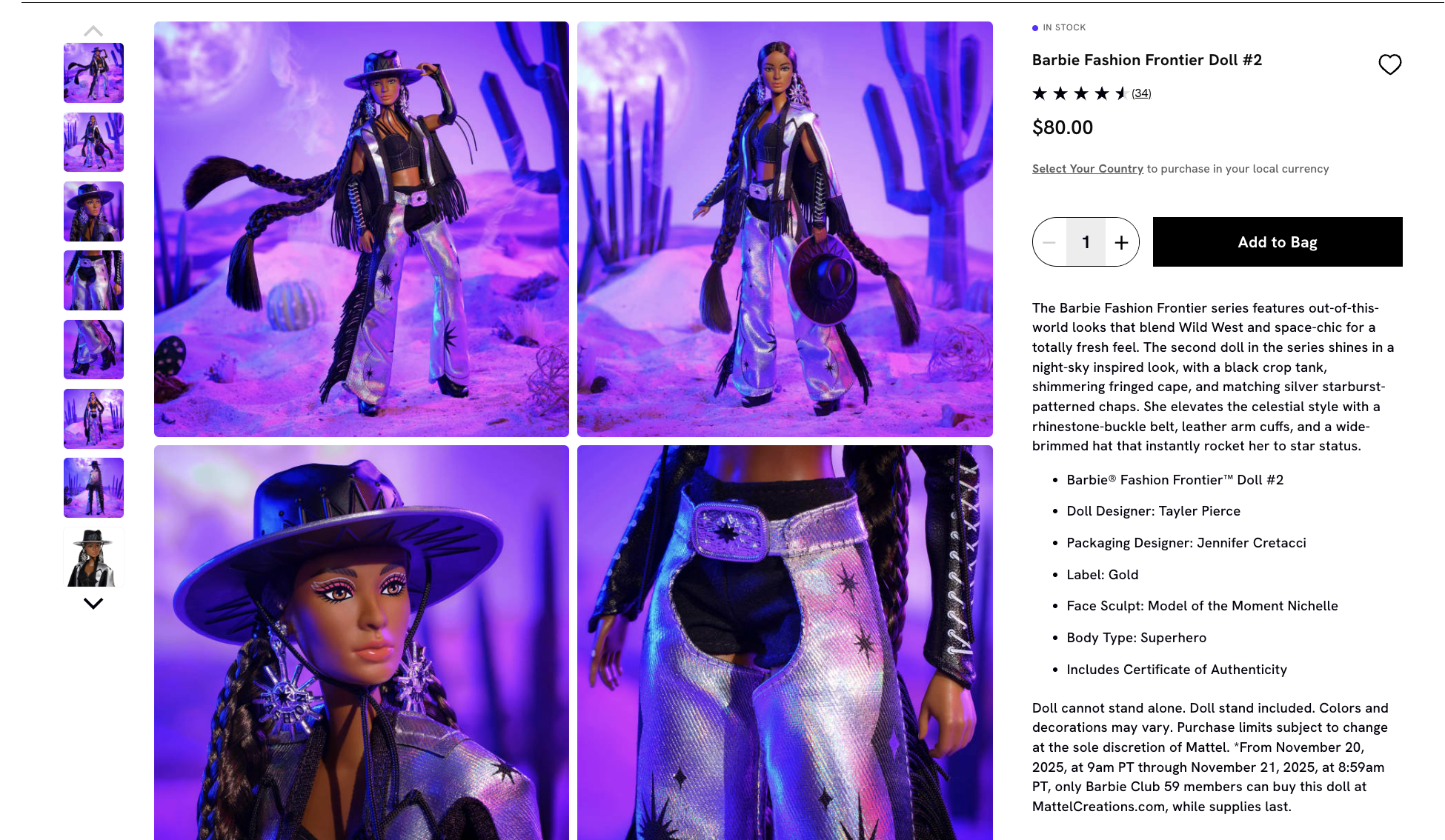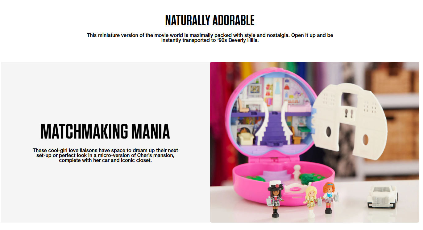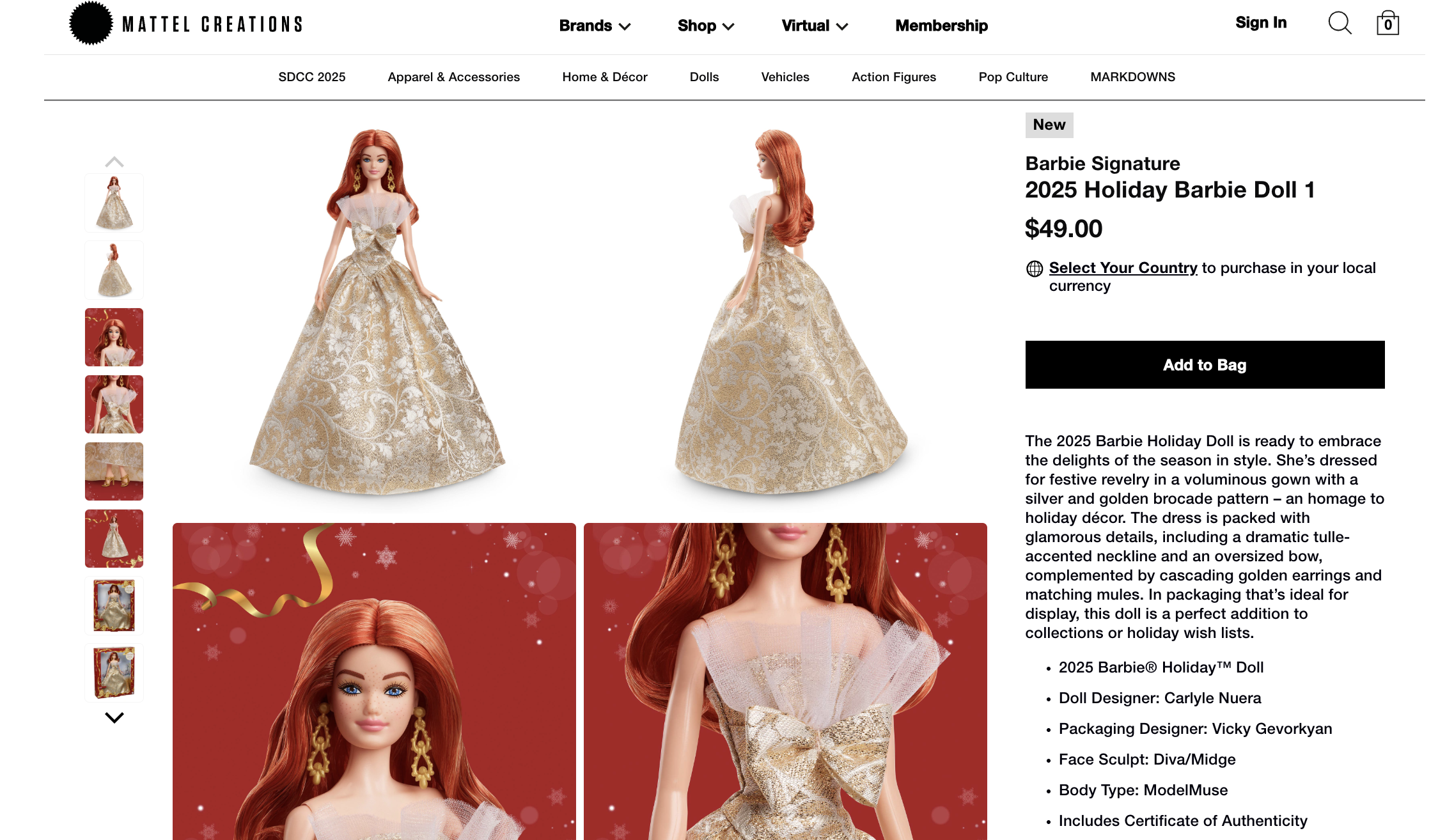 Examples of product pages done for various Mattel brands, intended for an adult collector audience.